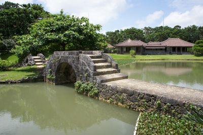 The garden combines Japanese landscaping principles with Okinawan architectural elements, including traditional tatami rooms and Chinese-influenced hexagonal pavilions.