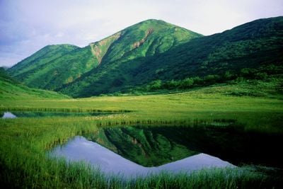 Mount Hiuchi reaches 2,462 meters in elevation and features deep snow conditions that support numerous alpine plants including the Siberian Dwarf Pine.