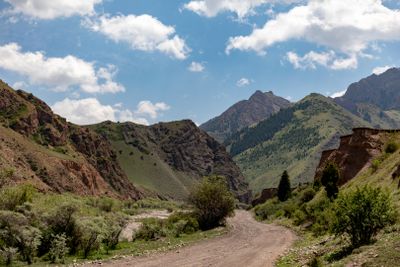 The village name translates to 'red basin' in Kyrgyz language, referring to the distinct copper-colored mountains that surround the settlement.