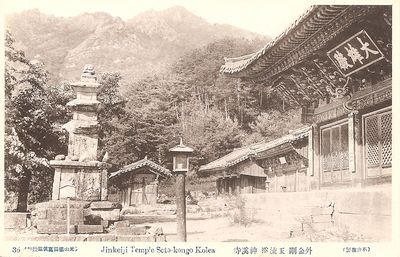 Singyesa is a Buddhist temple in Kosong County located on Mount Kumgang that was reconstructed after wartime damage. The complex comprises five main buildings arranged around a central courtyard, with entry gained through a two-story gate structure.