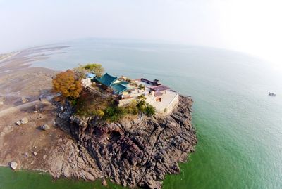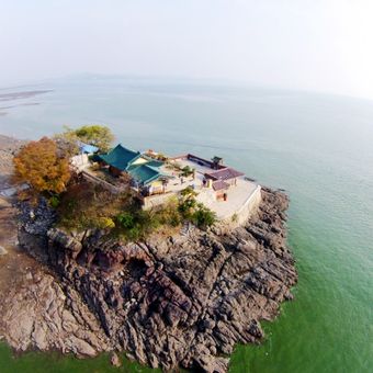 The hermitage stands on a large rock formation near Cheonsu Bay, providing views across the surrounding waters and coastal landscapes.