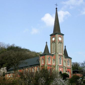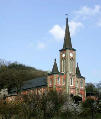The Gamgok Catholic Church features red and black brick architecture, designed as a smaller version of Myeongdong Cathedral by Father Pierre Chizallet.