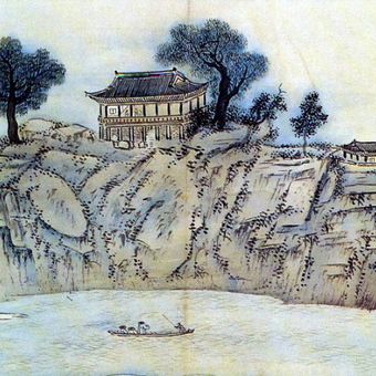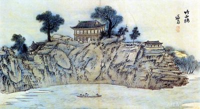 The elevated wooden pavilion stands on a cliff, featuring seven front sections and two side sections with decorative architectural elements.