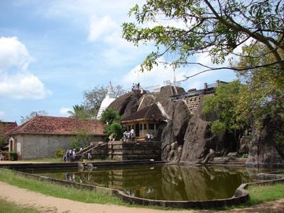 The temple exhibits the famous Isurumuniya Lovers carving, which depicts two figures in an intimate pose, associated with Prince Saliya and Asokamala.