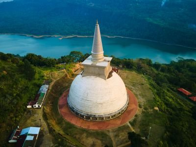 The Kotmale Mahaweli Maha Seya rises 88 meters high above the Kotmale Reservoir, ranking as the second-largest stupa in Sri Lanka.