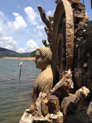 The ruins of Kadadora Vihara contain sculptured Buddha statues and deity figures situated beneath the waters of Kotmale Reservoir.