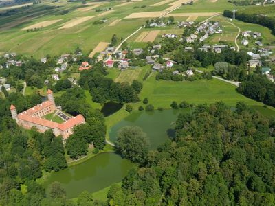 The castle features a central courtyard surrounded by four wings, with towers at each corner and five cascading ponds in the surrounding park.