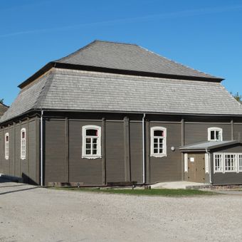 The synagogue building features architectural elements combining Lithuanian folk traditions with elements of Baroque and Classical styles in its wooden construction.