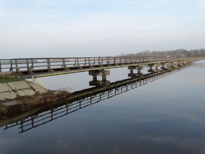 The Širvėna Lake footbridge is a wooden structure that spans across the water, connecting the city of Biržai with the Astravas estate on the opposite shore. The construction extends approximately 525 meters and is about 2.45 meters wide throughout its length.