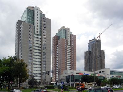 The dual-tower structure features 32 and 27 floors respectively, establishing itself as one of the most substantial vertical developments in Latvia.