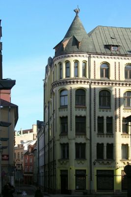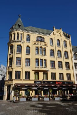 Located at Meistaru iela 10 in the center of Old Riga, the Cat House contains residential units and a restaurant on the ground floor.