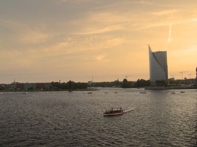 The structure stands near the Daugava River, creating a vertical landmark that connects the traditional old town with the modern business district.