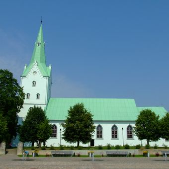 The Evangelical Lutheran Church stands in the central part of Dobele, featuring tall vaults and a traditionally designed altar with a decorated cross.