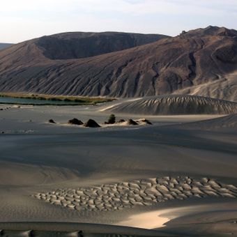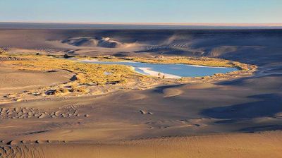 Waw an Namus is a volcanic crater in south-central Libya with three lakes occupying the lowest point of its basin and surrounded by date palms and shrubs. The depression drops steeply down from the sandy plateau above into this sheltered hollow.