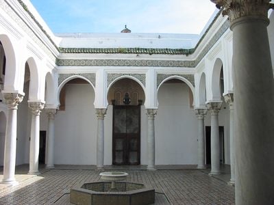 Dar el Makhzen is a royal palace in the Kasbah of Tangier, Morocco, with two inner courtyards featuring marble fountains, detailed wooden ceilings and richly decorated architectural elements. The structure extends over several levels and combines traditional Moroccan building craft with influences from the Mediterranean.