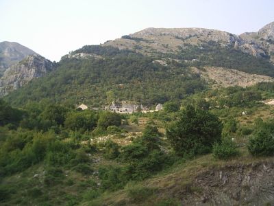 The monastery complex stands on the southern slopes of Mount Lovćen, featuring a church dedicated to the Holy Trinity and traditional stone architecture.