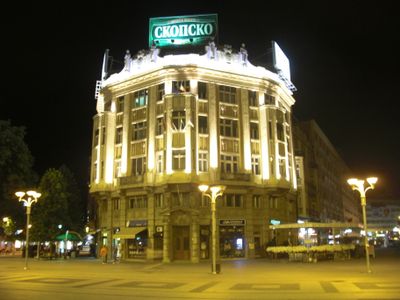 The rooftop features a large СКОПСКО sign advertising a local beer brand that is visible across Macedonia Square. This sign has become a recognizable landmark for those surveying the plaza.
