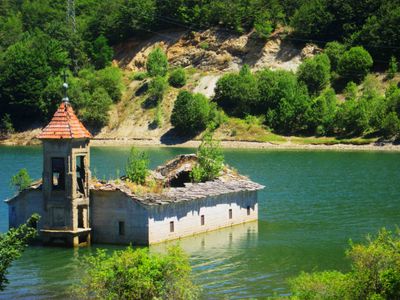 Submerged church of St. Nicholas, Orthodox church in Mavrovo, North Macedonia.