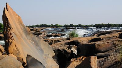 The Félou Falls cascade down 34 meters over a width of 1000 meters along the Senegal River, creating multiple rocky steps.