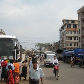 Bago is a city in Bago Region, Myanmar, located in a flat area surrounded by extensive rice paddies and agricultural land. The cityscape features religious structures and traditional buildings spread across different neighborhoods and districts.