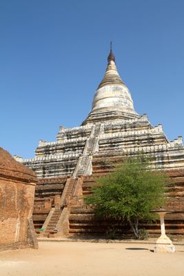 Shwesandaw Pagoda is a white stone shrine in Bagan featuring five square terraces that lead to a cylindrical stupa crowned by a decorative spire. The structure rises about 100 meters high and dominates the surrounding landscape with its geometric form.