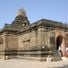 The temple features a square base with sandstone walls, intricate carvings of deities, and decorated pillars supporting the central vault ceiling.