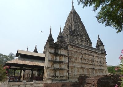 Mahabodhi Temple is a Buddhist temple in Bagan featuring a large pyramid-shaped tower with over 450 Buddha images set into niches across its surface. The structure rises in tiers of brick and stone, creating a distinctive silhouette that tapers toward the top.