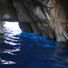 The water displays an intense blue color because sunlight enters through underwater openings and bounces off the sea surface below. This optical effect occurs because longer light wavelengths are absorbed while the blue light reflects back toward the visitor.