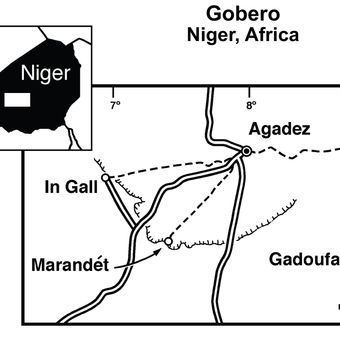 The Elrhaz Formation is a sandstone layer located near the western edge of the Ténéré Desert in Niger. It lies in one of the most remote parts of the Sahara and holds fossils of animals that lived in this region long ago.