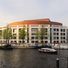 The Stopera complex features a curved white marble facade along the Amstel River, incorporating both municipal offices and performance spaces.