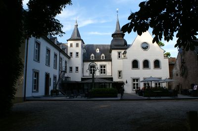 The white stone structure of Doenrade Castle stands with its tower and wing additions, surrounded by gardens in the Limburg countryside.