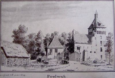 Gepleisterde boerderij op T-vormige plattegrond, naast de poorttoren van Poelwijk. Deuromlijsting met consoles onder het hoofdgestel en bovenlicht met levensboom