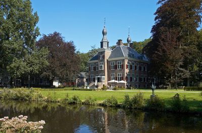 The estate features traditional Dutch castle architecture with ornate details, surrounded by gardens near the edge of the Veluwe region.