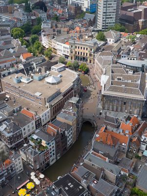 The Stadhuisbrug extends across the Oudegracht canal, forming a central intersection that connects multiple streets in Utrecht's medieval center.