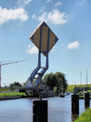 The Slauerhoffbrug spans the Harlingervaart with two mechanical arms that lift a 15-meter square section of road to allow water traffic passage.