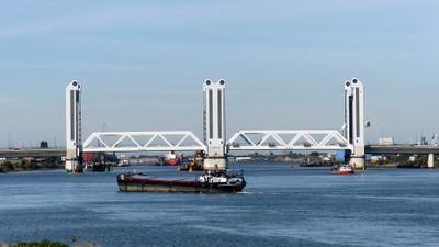 The Botlekbrug spans across the Oude Maas river with a 92-meter-long main section that accommodates both rail tracks and road traffic lanes.