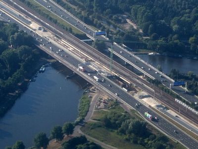 The bridge complex extends between 239 and 265 meters in length, with a main span of 75 meters and provides passage for 216,100 vehicles daily.