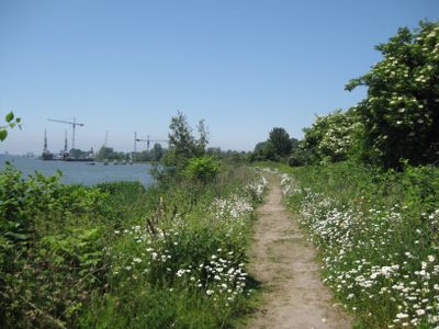 Schellingwouderpark spans 10 hectares along the northern banks of the IJ River, featuring walking paths and recreational areas between Oranjesluizen and Oranjewerf.