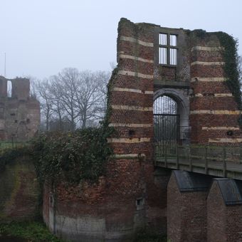 Batenburg Castle is a fortress ruin in Wijchen that features three round towers with basement levels, a substantial ring wall, and remnants of its original gatehouse positioned around a water moat. The construction method using fieldstone reflects medieval defensive building techniques from the region.