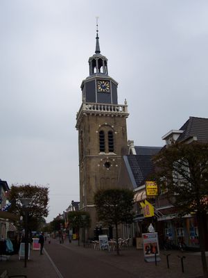 The stone church stands with its pointed tower and large windows, featuring traditional Dutch architectural elements from the 17th century religious construction period.
