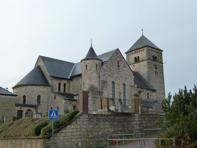 The Sint-Remigiuskerk stands at the highest point of Klimmen village, featuring both Romanesque architecture and a cemetery surrounding the structure.