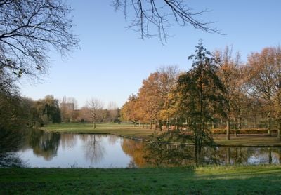 The Erasmuspark spans 6 hectares, featuring long walking paths, rectangular lawns, and a central pond surrounded by diverse tree species.