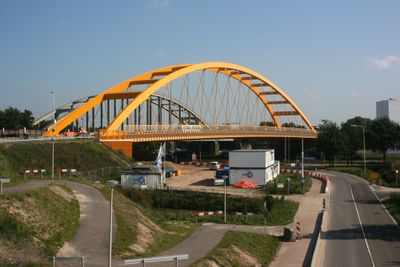 The bridge design integrates modern engineering with urban planning principles, reflecting the Dutch approach to sustainable transportation infrastructure.
