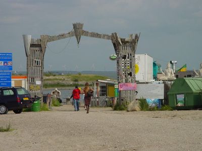 Blijburg extends along the eastern waterfront of Amsterdam with a sandy shoreline that borders the IJmeer Lake, offering swimming and sunbathing areas.