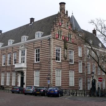 The three-story building features grand proportions with intricate architectural details, high windows, and a central entrance facing the Kromme Nieuwegracht canal.