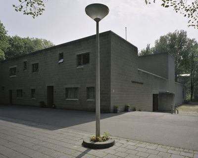 Pastoor van Arskerk is a Catholic church in the Loosduinen district with a layout of three connected rooms, including a sanctuary and community space. The building features concrete block walls and sits on a wooded site, with cylindrical volumes marking its entrance.