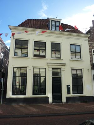 Pand met blauwgepleisterde gevel met rechte kroonlijst onder zadeldak, terzijde in topgevel eindigend met opzet