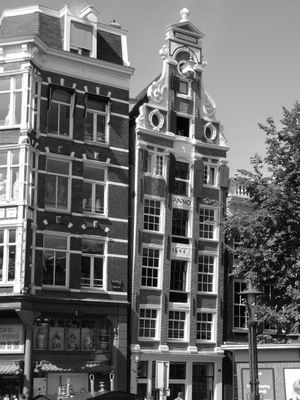 Twee huizen achter een gezamenlijke gevel met in- en uitgezwenkte top