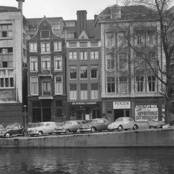 Pand met gevel onder rechte lijst met 'triglyfen' en dakvoorschot, building in Amsterdam, Netherlands