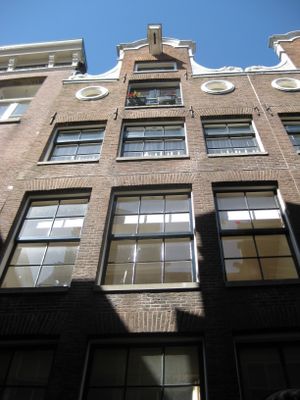 Pand, later met een verdieping verhoogd huis, waarvan de gevel wordt afgesloten door een uit- en ingezwenkte top onderrollagen